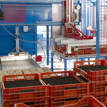 Укладчик для поддонов или ящиков быстро и легко программировать; вращающаяся втулка позволяет разместить лотки на поддоне для оптимизации пространства. Простое программирование для оператора с 5,7-дюймовой цветной сенсорной панелью